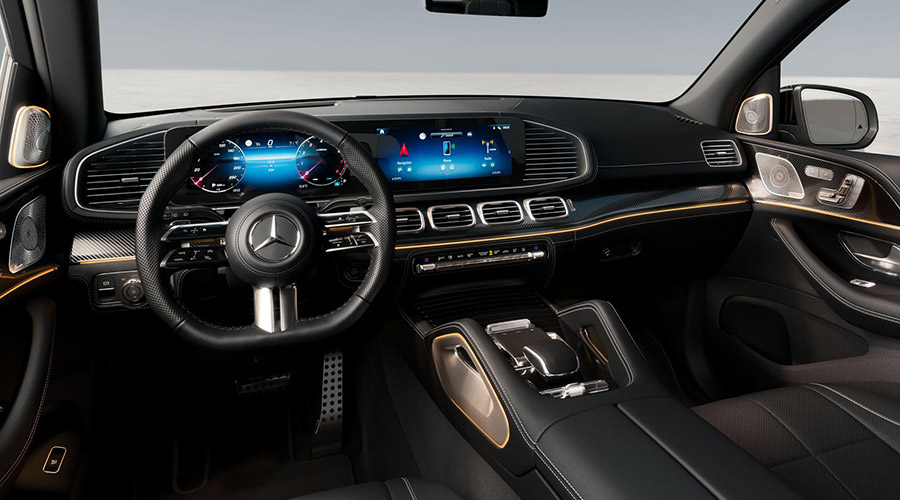 The interior of the GLS already offers extensive highlights as standard, such as the MBUX multimedia system and a multifunction sports steering wheel.